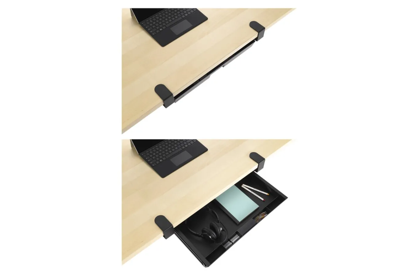 Declutter your desk and keep office supplies out of the way, yet easily within reach, with the Clamp-On Storage Drawer. Solid, stable, non-permanent C-clamp design installs in minutes with no tools or modifications to the desk or table — just clamp and go. Smooth-moving rail with two level adjustments provides ample tray clearance to accommodate everything from slim and mechanical gaming keyboards; to standard and vertical mice; to trackballs; to pens, markers, pads, and notebooks. Fits desks and tables up to 1.77" (4.5 cm) and has a 26.4 pound (12 kg) weight capacity. TAA-compliant.