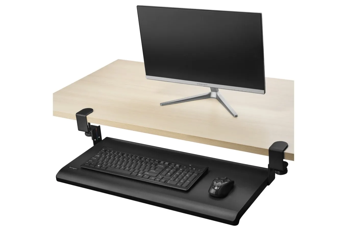 Extended keyboard use may contribute to wrist pain, shoulder tension, and poor posture. The SmartFit™ Clamp-On Keyboard Drawer creates a more comfortable typing position for wrists and forearms, saves space, and keeps your work area clutter-free. Thoughtfully designed to simplify proper ergonomic fit, the height-adjustable design aligns the hands, wrists, and arms in a neutral position, reducing strain and supporting better overall body alignment. It installs in minutes without tools using sturdy metal clamps, ensuring a damage-free experience.